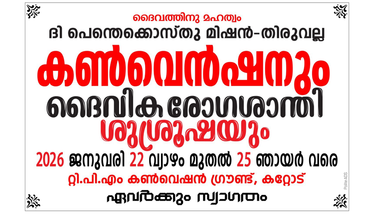 തിരുവല്ല: ദി പെന്തെക്കൊസ്ത് മിഷൻ തിരുവല്ല സെന്റർ വാർഷിക കൺവൻഷൻ നാളെ ജനുവരി 22 മുതൽ 25 ഞായർ വരെ കറ്റോട് റ്റി.കെ റോഡിന് സമീപമുള്ള റ്റി.പി.എം കൺവൻഷൻ ഗ്രൗണ്ടിൽ നടക്കും.