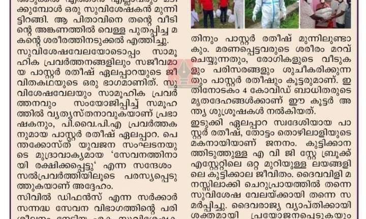 സാമൂഹ്യ പ്രവർത്തനങ്ങളിൽ സജീവമായ പാസ്റ്റർ രതീഷ് ഏലപ്പാറയെന്ന സുവിശേഷകൻ ഒരു മാതൃകയാണ്