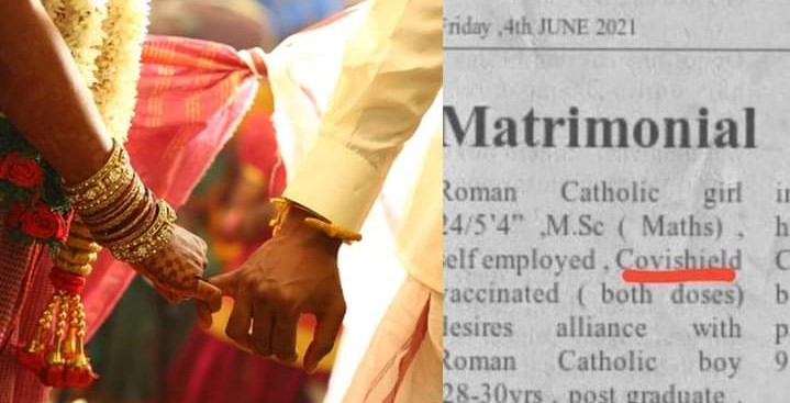 റോമൻ കത്തോലിക്ക് യുവതി, കണക്കിൽ ബിരുദാനന്തര ബിരുദം, 24 വയസ്സ്, സ്വന്തമായി തൊഴിൽ എന്നതിനൊപ്പം കോവിഷീൽഡ് വാക്സീന്റെ രണ്ട് ഡോസും എടുത്തിട്ടുണ്ടെന്ന് യുവതി പരസ്യത്തിൽ പറയുന്നു. ബിരുദാനന്തര ബിരുദധാരിയായിരിക്കണം, ക്ഷമാശീലവും നർമ്മബോധവും വായനാശീലവും ഉള്ള കോവിഷീൽഡ് വാക്സീന്റെ രണ്ട് ഡോസുകളുമെടുത്ത യുവാക്കളിൽ നിന്ന് ആലോചനകൾ ക്ഷണിക്കുന്നവെന്നാണ് പരസ്യം.