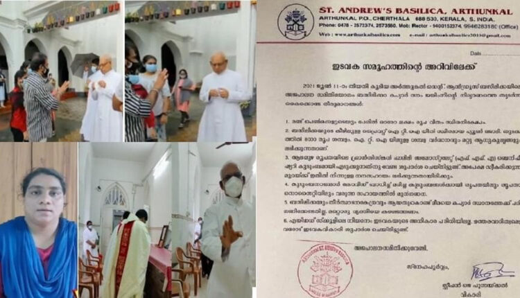ആലപ്പുഴ: അർത്തുങ്കൽ സെന്റ് ആൻഡ്രൂസ് ബസിലിക്ക പള്ളിയിലെ കപ്യാരായിരുന്ന സാം ജെയിംസ് മരിച്ചതിനെ തുടർന്ന് ഭാര്യ ലീമാ സാം പള്ളിയിലെ കപ്യാരായി മുൻപോട്ട് വന്നത് വിവാദമായി .കുർബ്ബാന നടക്കുമ്പോൾ വെള്ള വസ്ത്രം ധരിച്ചെത്തിയ ലീമ അച്ചന്മാർക്കൊപ്പം അൾത്താരയിൽ ഉണ്ടായിരുന്നു . ലീമയെ തടയാൻ വികാരി ശ്രമിച്ചെങ്കിലും ലീമയ്ക്കൊപ്പമെത്തിയ ചിലർ എതിർത്തു. തുടർന്ന് കുർബ്ബാനയിൽ ലീമ അൾത്താരയ്ക്ക് സമീപം നിന്ന് പങ്കെടുക്കുകയായിരുന്നു.