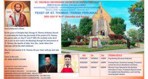 ഷിക്കാഗോ: ഷിക്കാഗോ സെന്റ് തോമസ് ഓര്ത്തോഡോക്സ് ഇടവകയുടെ കാവല്പിതാവും ഇന്ത്യയുടെ അപ്പോസ്തോലനുമായ പരിശുദ്ധ മാര്ത്തോമാ ശ്ലീഹായുടെ ദുഖറോനോയും ഇടവക പെരുന്നാളും ജൂലൈ 3, 4 (ശനി, ഞായര്) തീയതികളില് ഭക്തിയാദരപൂര്വ്വം കൊണ്ടാടുന്നു.